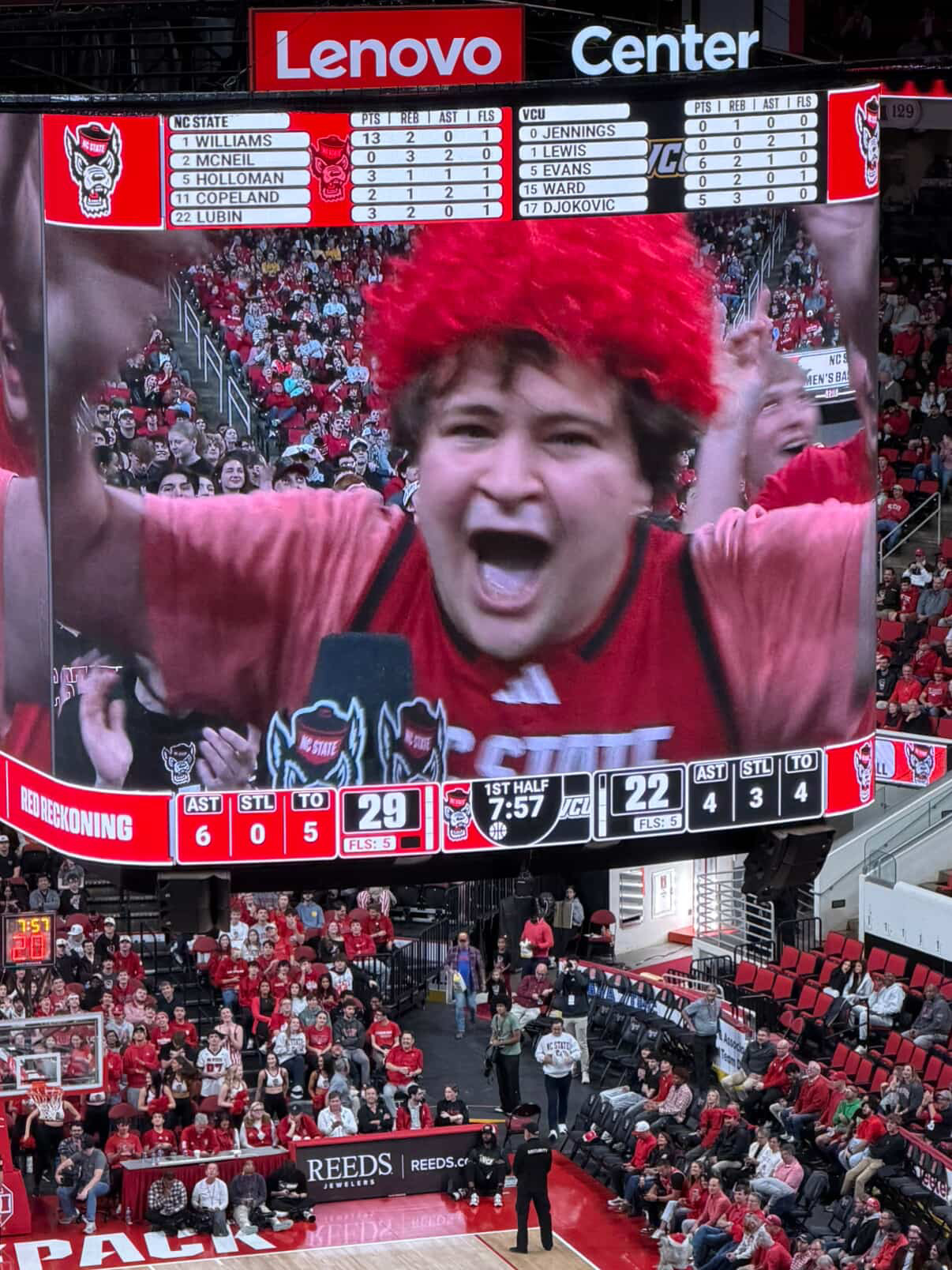 Jumbotron Sam Andre | December 3, 2025 In case you missed it at the Lenovo Center, sam was on the Jumbotron and won a prize (jewlery gift card?) for answering obscure NC State Basketball trivia. Go Sam!