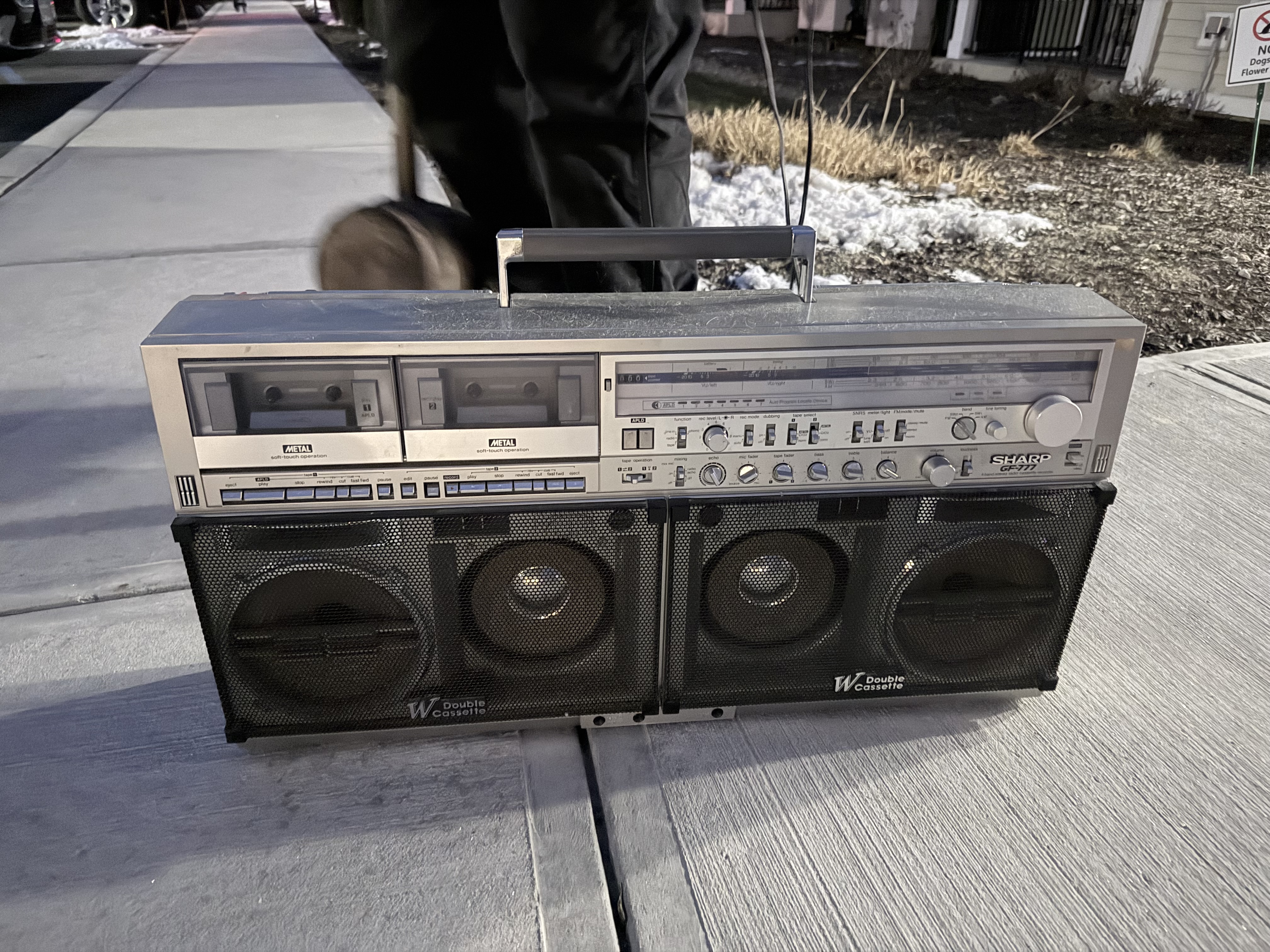 Neighbor upstairs moving out slowly, and collected a lot of things, one of which is this awesome boombox. Not to mention the circus mallet in the other hand!